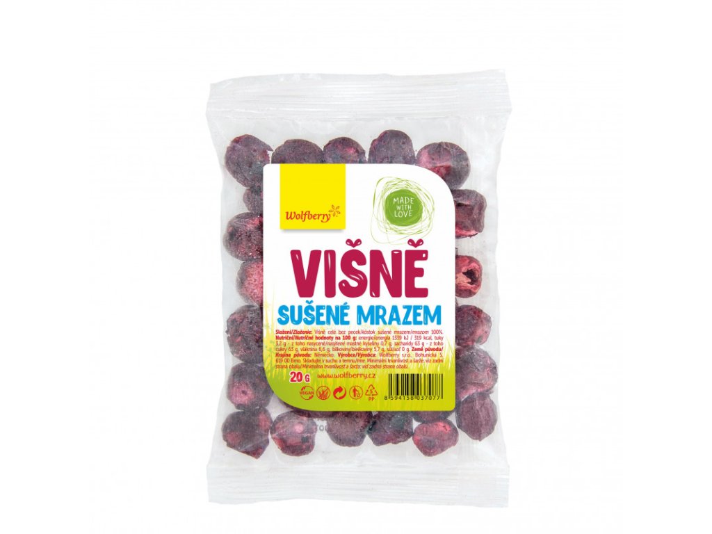 Višně Wolfberry 20 g. Sušené plody višně ocení všichni, kteří preferují kyselkavější chuť. Toto ovoce má navíc své místo i v přírodní medicíně. S metodou sušení mrazem zůstává přirozená barva, aroma i chuť čerstvého ovoce, není proto třeba barviv nebo dochucovadel.
